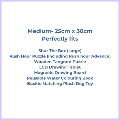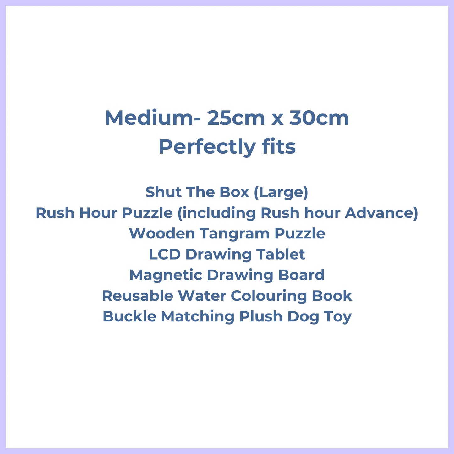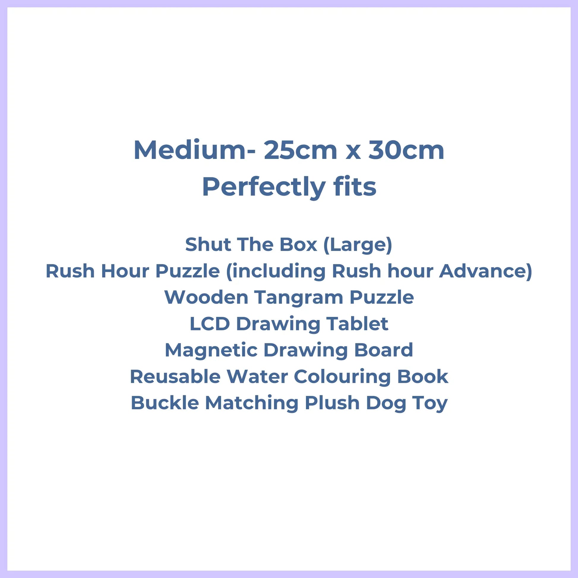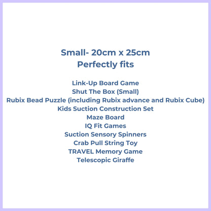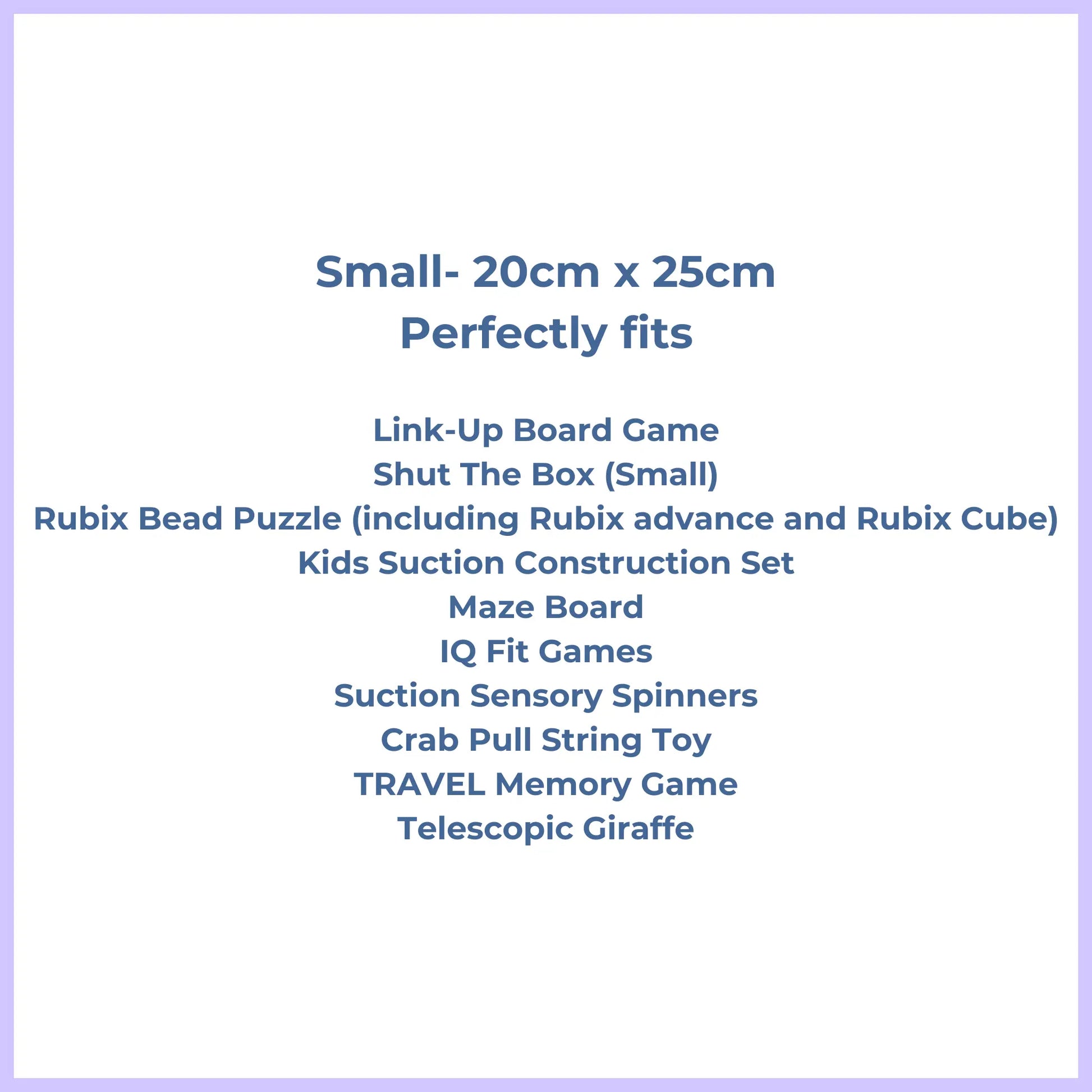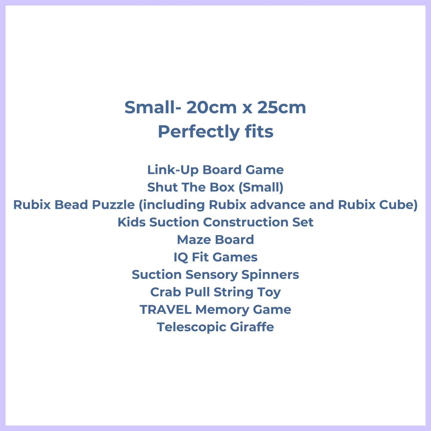 Please remember all Travel Toy Bundles and Packs will already come in ONE free Satin Bag. All individual Toys and Puzzles purchased will also be Bundled into ONE Free Satin Bag. Please see below example of an order and how it will be packed.Ā