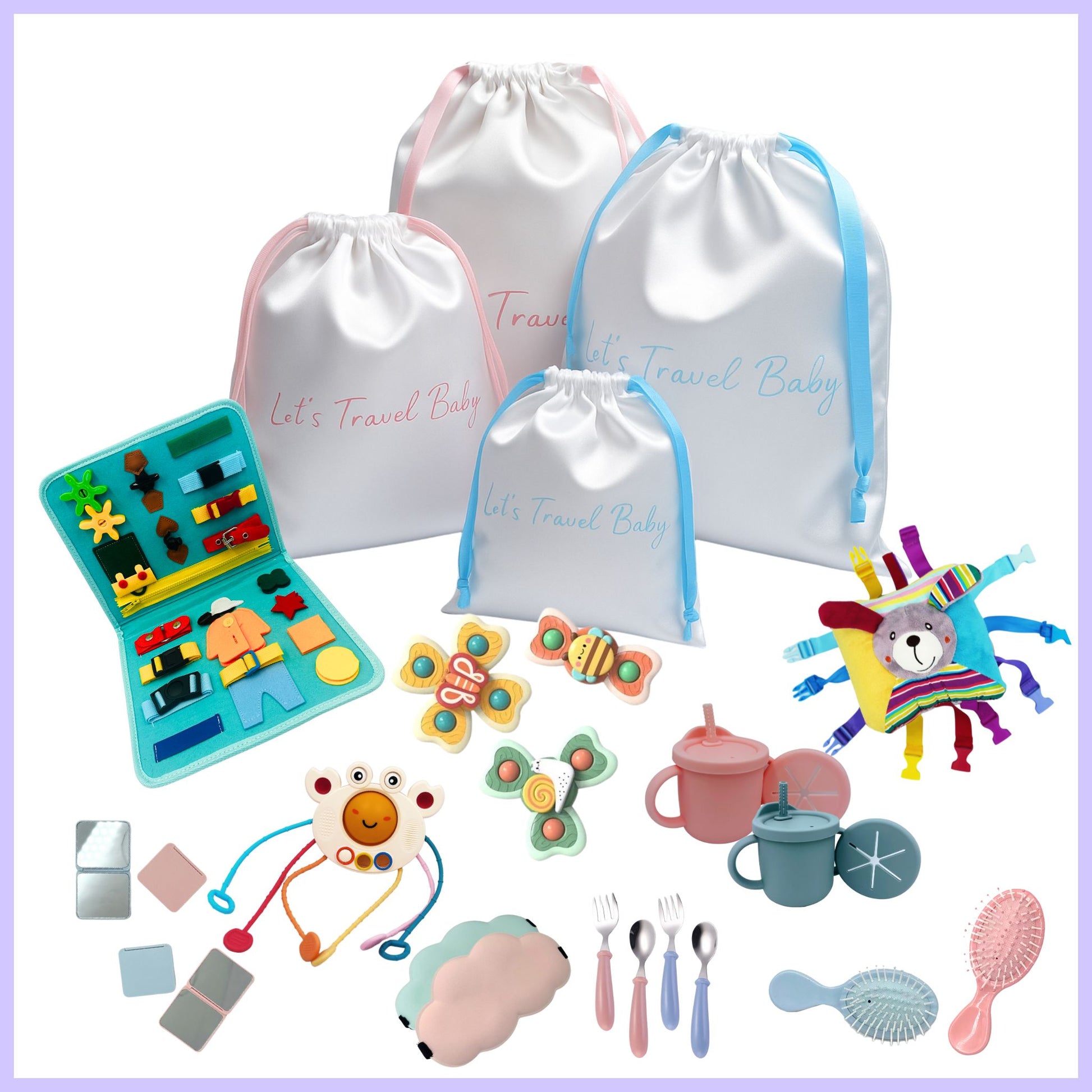 Keep your toddler engaged and happy during travel with our Toddler Toy & Compact Travel Accessories Kit. Designed for children aged 1 to 3, this pack includes a variety of sensory and developmental toys that are perfect for on-the-go fun.